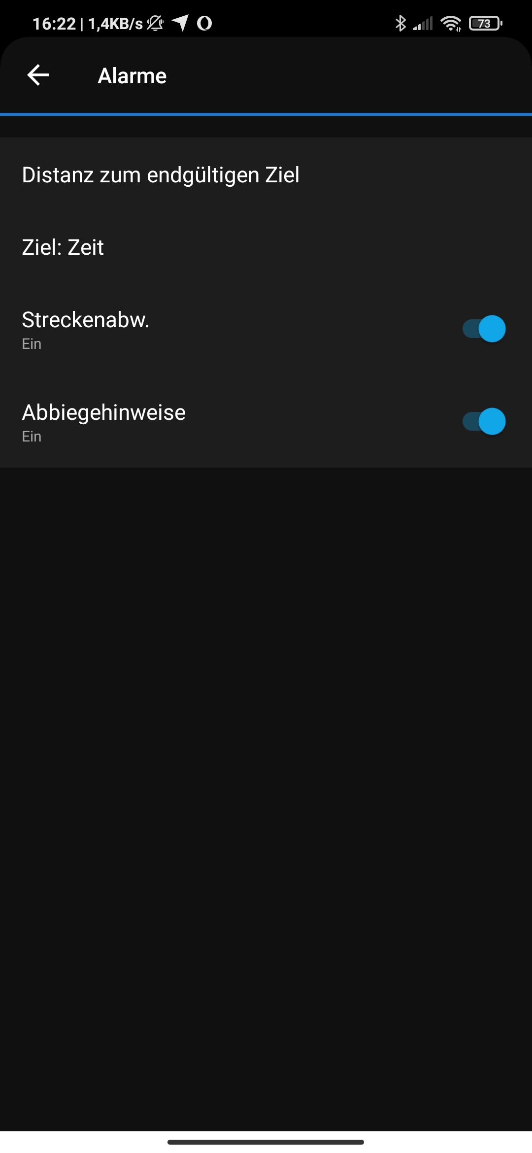 Wer mag kann unter "Alarme" z.B. noch einen Distanzalarm einrichten (z.B. "Warne mich wenn ich nur noch 1 km vom Ziel entfernt bin").