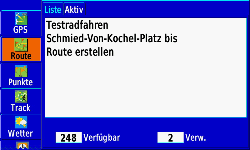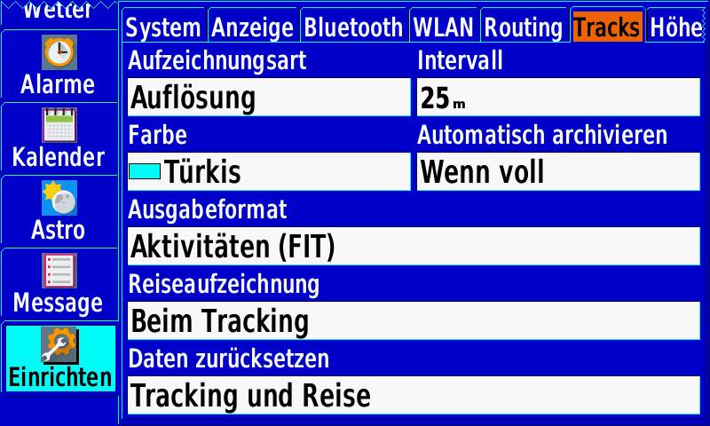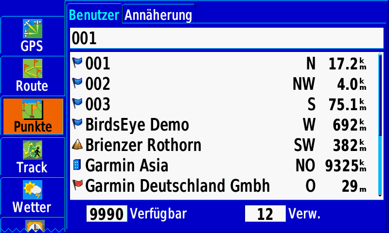 - Tracks, Routen: 10.000 Wegpunkte, 250 Routen, 250 Tracks (20.000 Punkte)