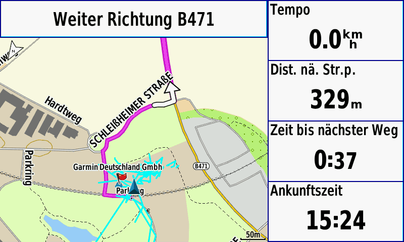 Zur guten Ablesbarkeit – insbesondere von Karten – trägt die Auflösung von 800 x 480 Pixel bei, die Karten gestochen scharf erscheinen lässt. Dazu kommt ein flotter Kartenaufbau, am Prozessor hat Garmin also anscheinend nicht gespart.