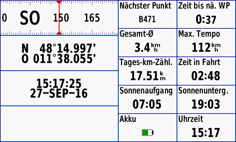 - GPS, Sensoren: GPS / GLONASS, Höhenmesser, 3-Achsen-Kompass