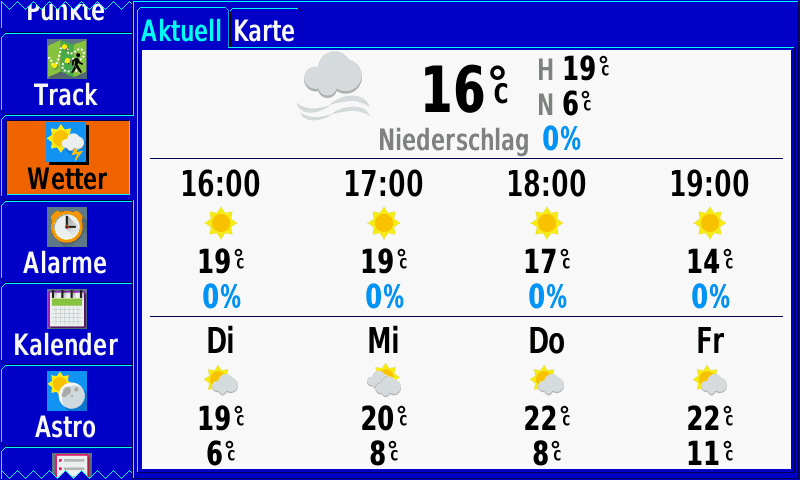 - NEU: zusätzlich zu Wetterinformationen und -vorhersagen animiertes Wetterradar auf der Kartenseite