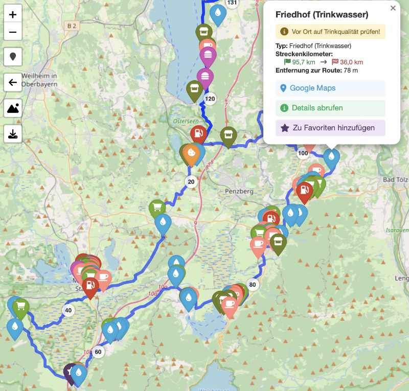 - OnRouteMap generiert eine Karte mit der Route und sämtlichen relevanten POI, die sich gemäß der vorgegebenen Luftliniendistanz entlang der Route befinden: Trinkwasserquellen, Friedhöfe, Tankstellen, Supermärkte, Unterstände (z.B. an Bushaltestellen) etc.