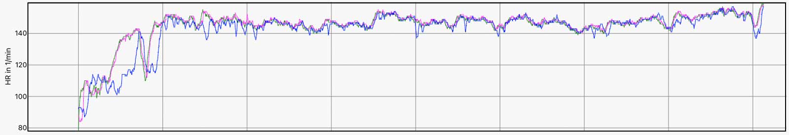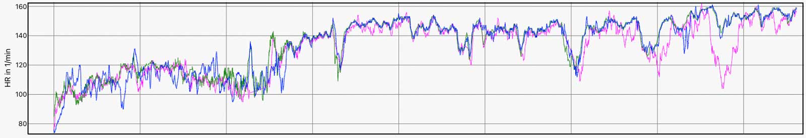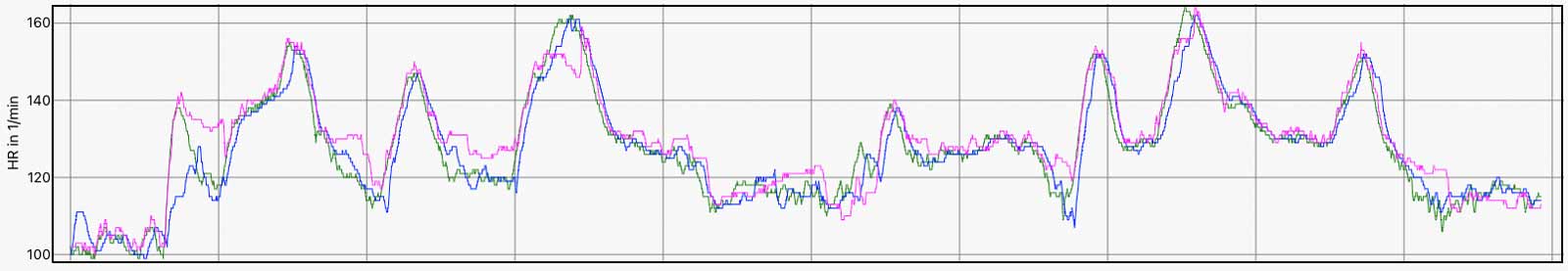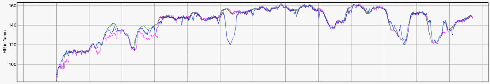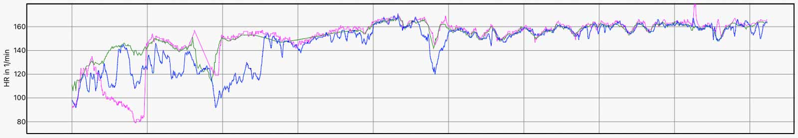 Die folgenden Abbildungen zeigen die Herzfrequenzdaten von unterschiedlichen Aktivitäten – teilweise bei kernigen Minusgraden sowie kräftigem Wind, was zu einem Auskühlen der Arme führt und ungenaue Werte als Folge haben kann (z.B. Beispiel 5 am Anfang). Enge Bündchen der Winterbekleidung können zudem für ein Rutschen & Wackeln der Sportuhren sorgen.