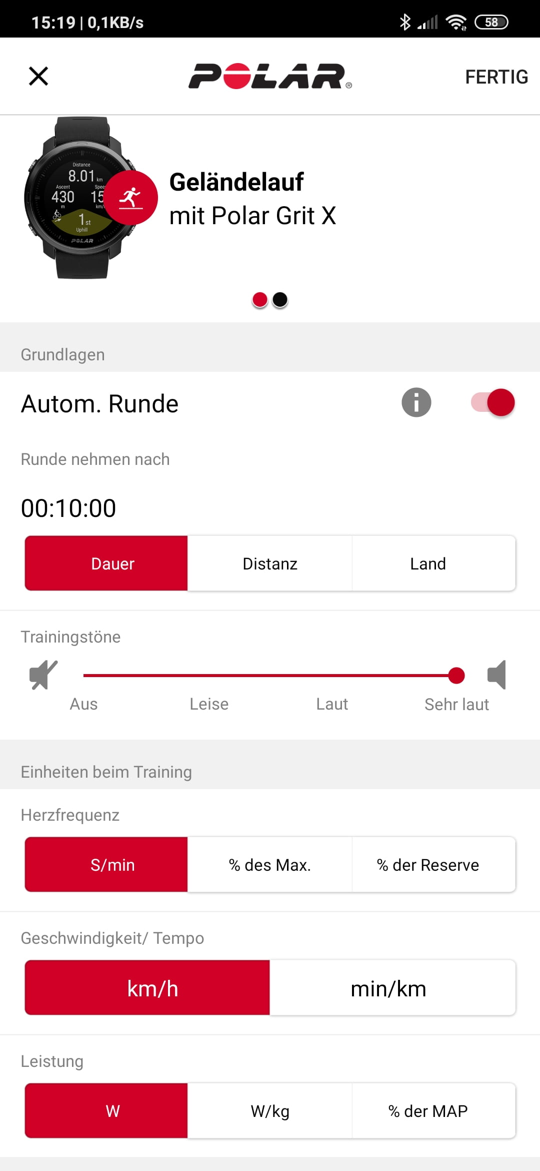 Die folgende Galerie (anklicken) zeigt alle Konfigurationsmöglichkeiten in der Flow App für die Aktivität "Geländelauf".