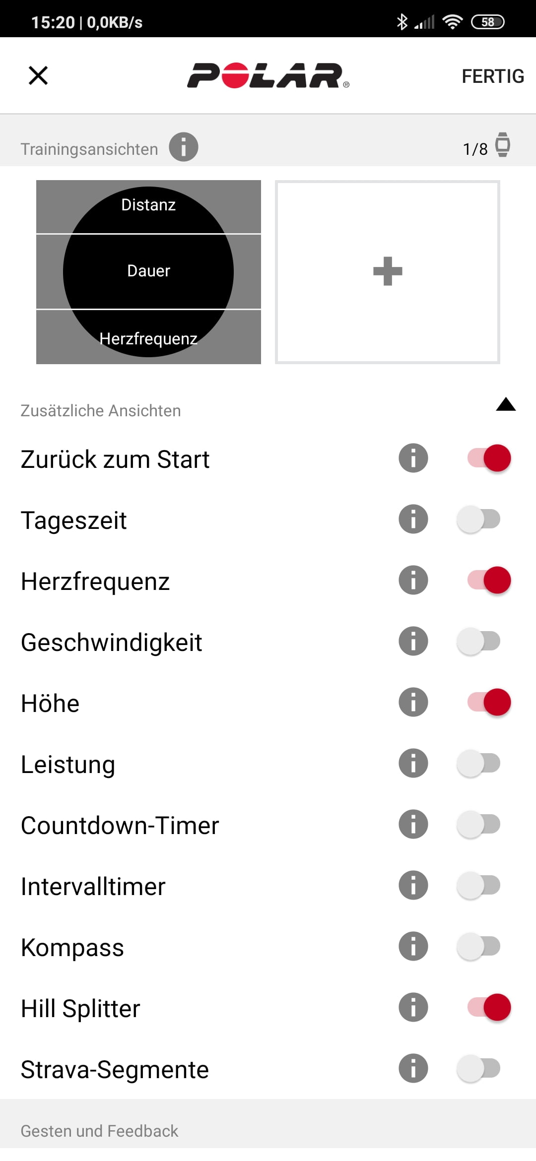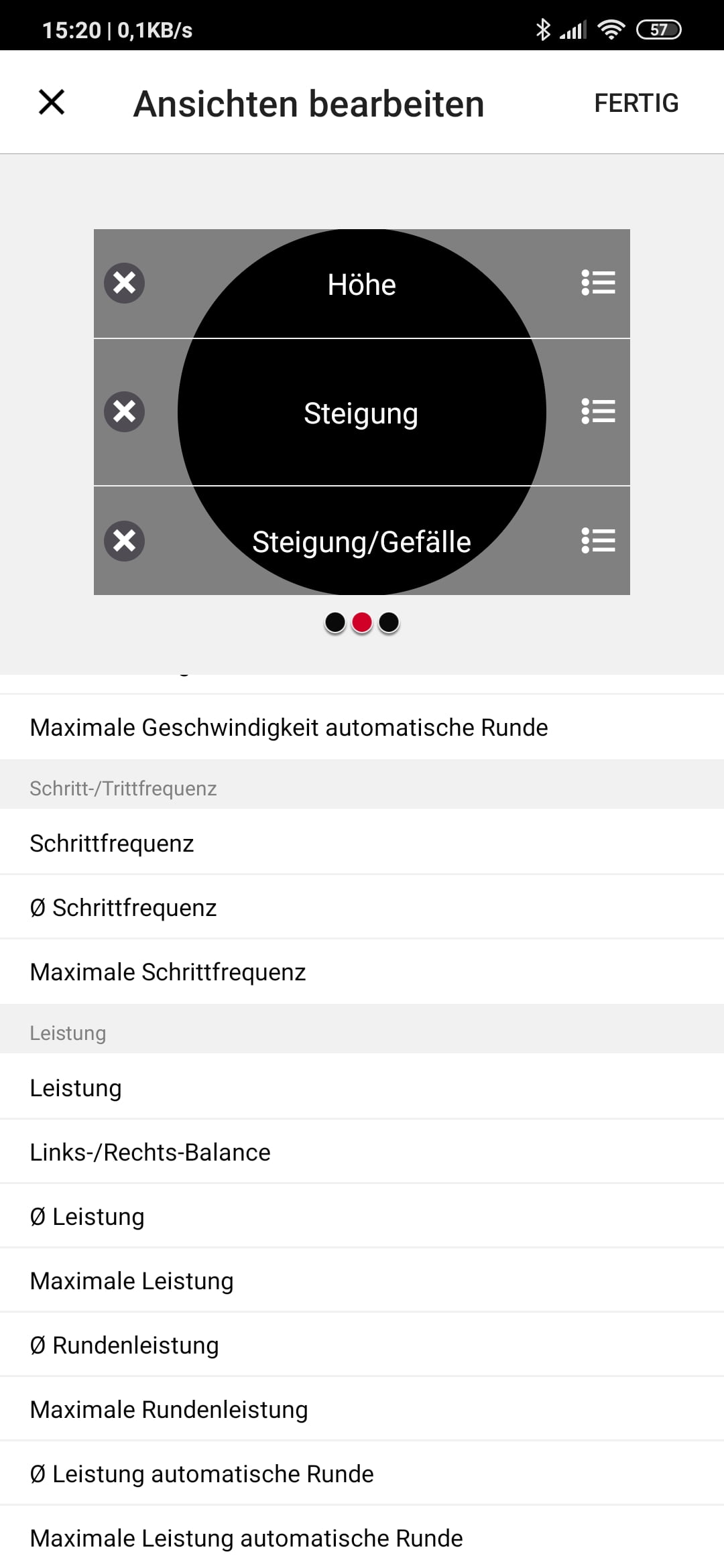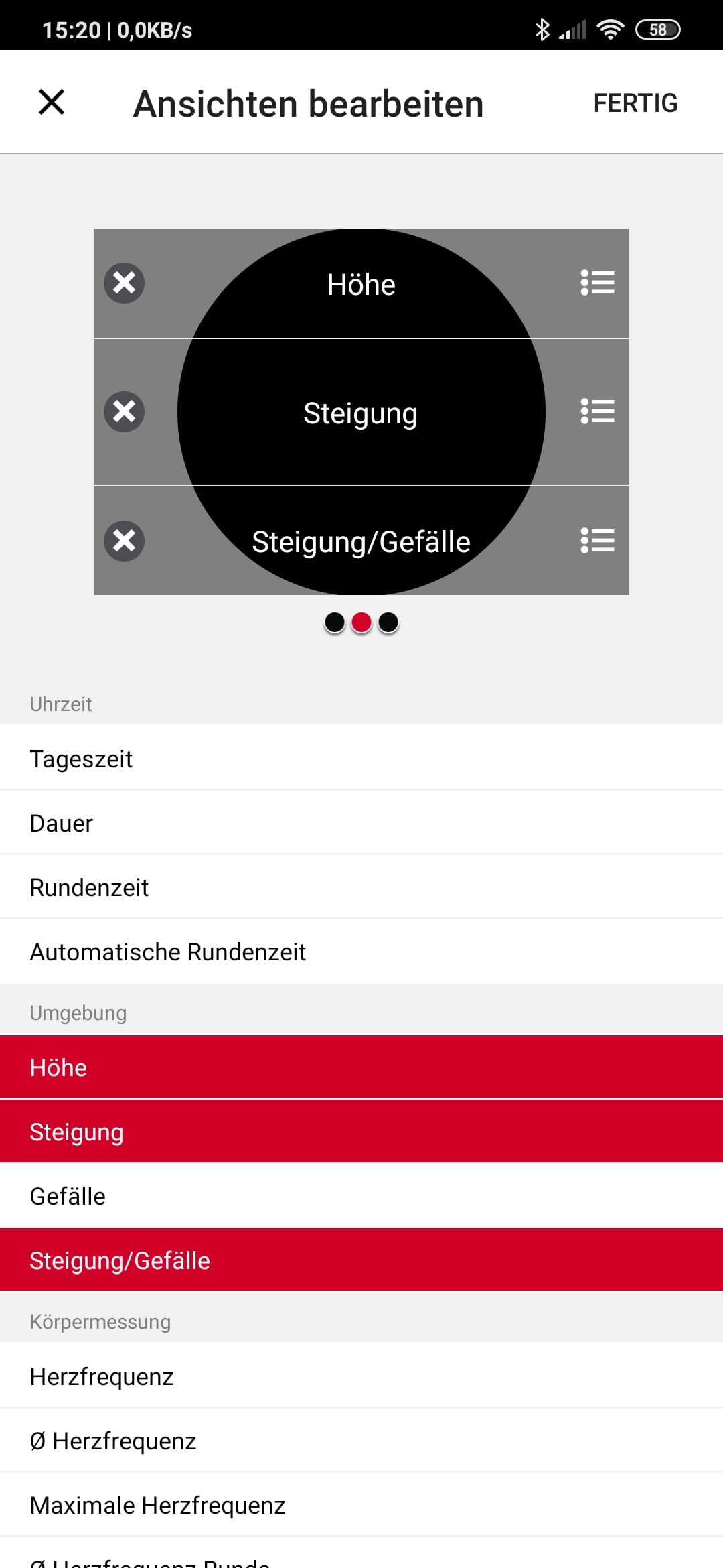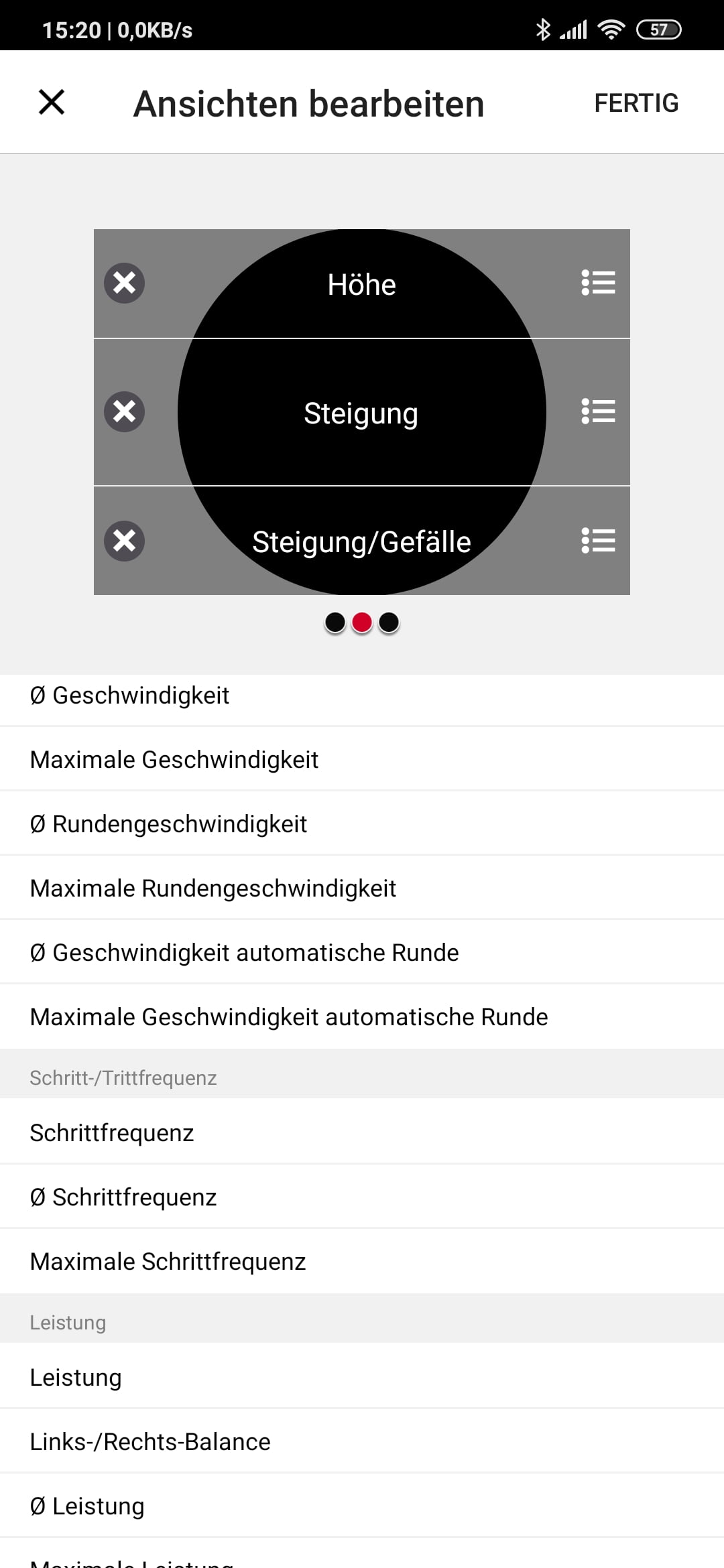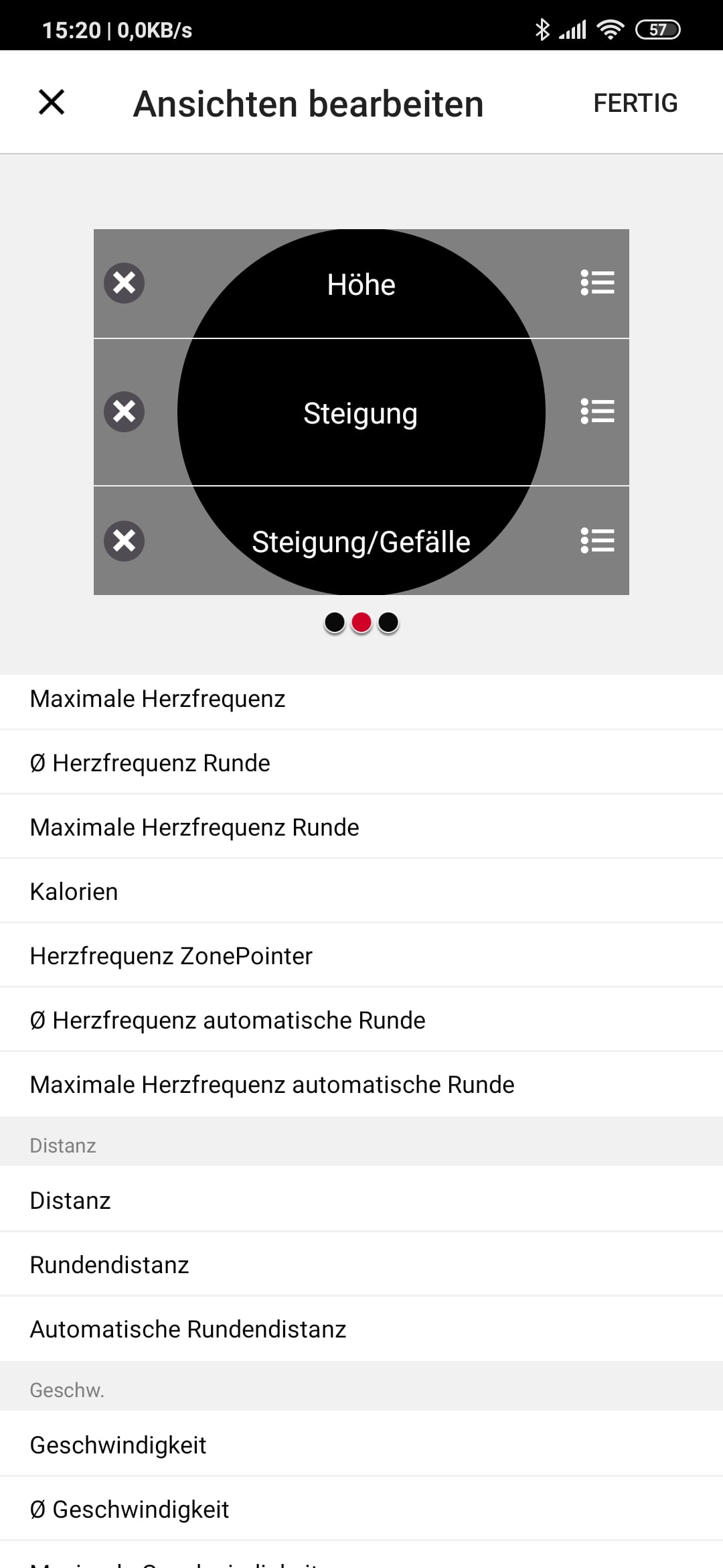 Für die zahlreichen Trainingsansichten (Datenseiten) – es sind bis zu vier Felder pro Seite möglich – stehen unterschiedliche Datentypen zur Auswahl (siehe Abbildungen unten). Einen Typ vermisse ich aber: Es gibt keine Vertikalgeschwindigkeit, Praktisch ist das Anordnen der Felder in der App durch ein komfortables Verschieben per Finger, gleiches gilt für die Abfolge der Sportprofile.