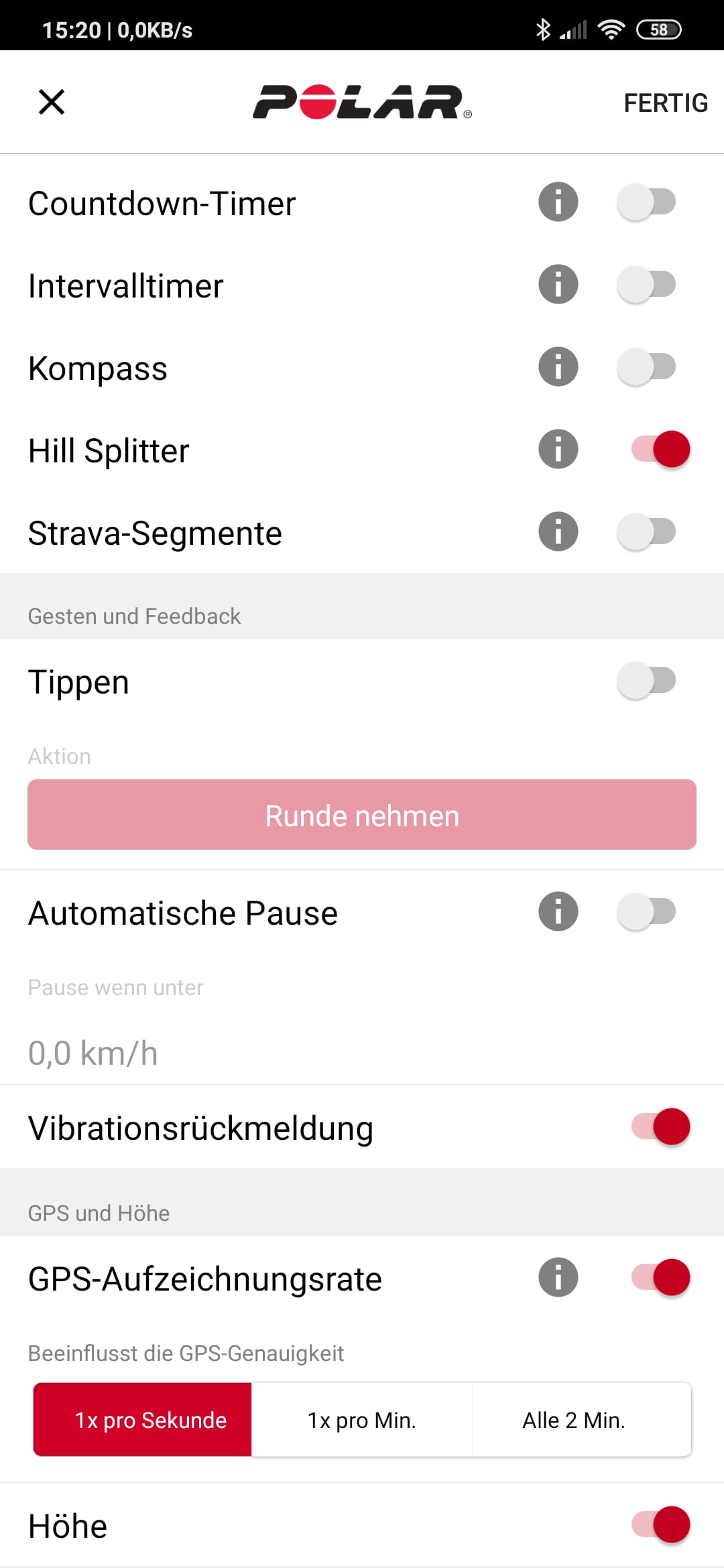 Zum Barometer schreibt Polar, dass die per Luftdruck gemessene Höhe während den ersten Minuten eines Trainings automatisch zweimal per GPS kalibriert wird. Vor der Kalibrierung gemessene Werte werden rückwirkend korrigiert. Ein manuelles Kalibrieren ist interessanterweise nur nach dem Starten eines Trainings durch Eingeben der aktuellen Höhe möglich. Manuelles Kalibrieren ist eigentlich die übliche Methode, um besonders genaue Höhenwerte zu erhalten.