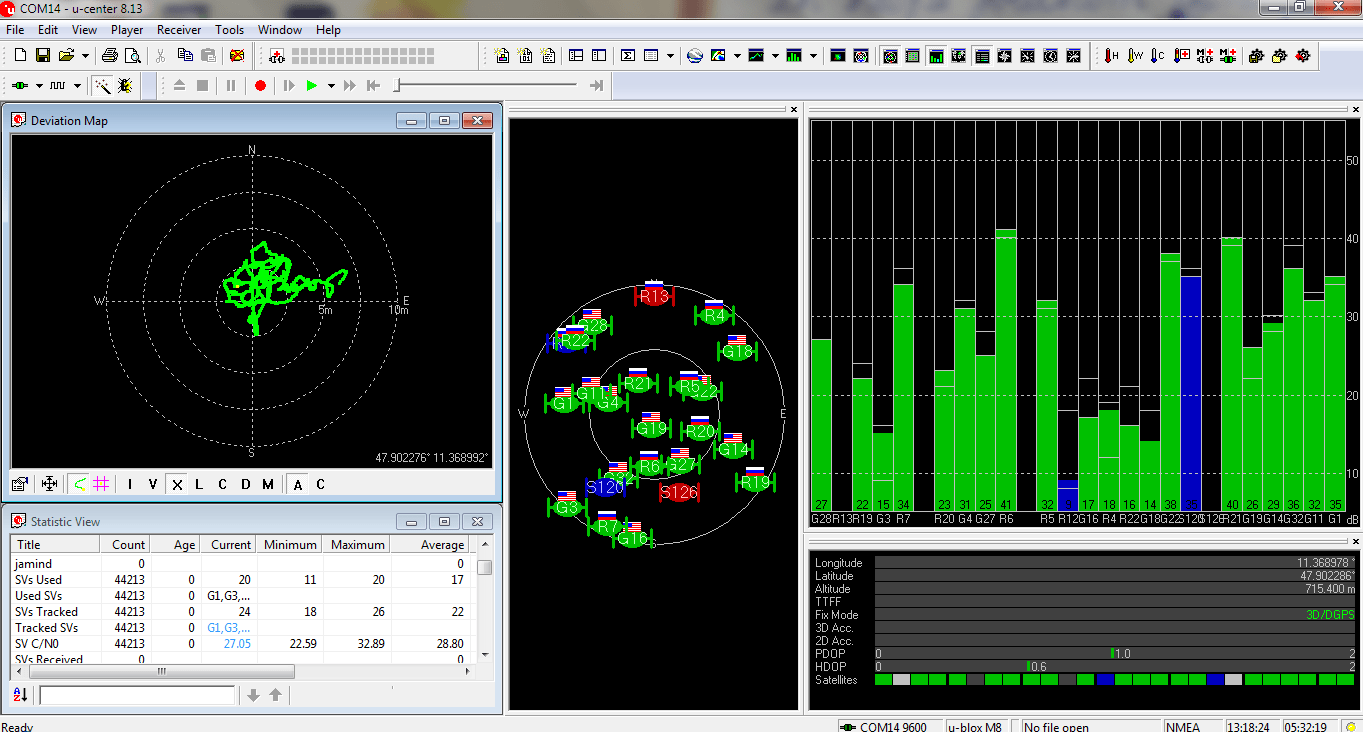 Mit der u-center Software lassen sich nicht nur Daten auswerten und visualisieren, sondern auch der Empfänger konfigurieren. Zu den wichtigsten Einstellungen gehört die Auswahl der Positionierungssysteme. In Deutschland ist die Einstellung GPS & GLONASS sinnvoll (SBAS je nach Anwendungszweck). Zum Konfigurieren sollten unbedingt die aufgeführten Handbücher herangezogen werden. u-center unterstützt auch die Übertragung von AssistNow-Daten auf den GPS-Empfänger. AssistNow gewährleistet eine rasante Positionsbestimmung.