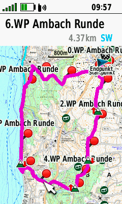 Am Startpunkt des Tracks wird wie gewohnt die Track-Navigation gestartet. Die auf der Karte zusätzlich angezeigten Wegpunkte geben die Richtung vor.